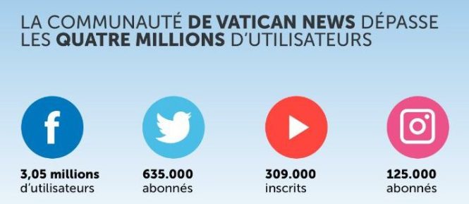 Concernant Twitter, les six comptes linguistiques @vaticannews ont acquis une visibilité immédiate. Dans le décompte, il faut aussi ajouter le canal unique multilingue Vatican News sur Instagram. Aux trois plateformes sociales s’ajoute aussi le canal Youtube (en six langues), également sous la marque Vatican News, qui offre à l’utilisateur des vidéos en direct et à la demande sur les activités du Saint-Père.