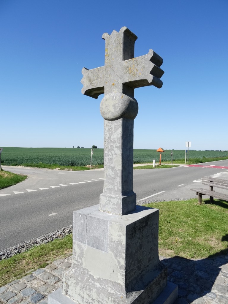 Cette croix en pierre trône au carrefour de chemins de traverses. Et « trôner » est le bon mot parce qu’avec ses trois mètres de haut au cœur d’une plate campagne, il n’y a pas de doute : elle est visible de loin.