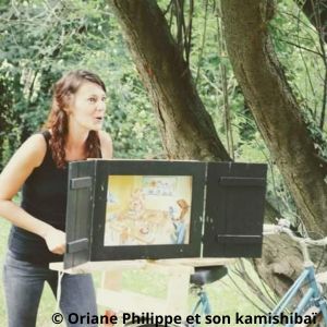A défaut de publier ses histoires pour enfants, l’écrivaine de 32 ans, originaire du Brabant wallon, les raconte à l’aide de son vélo kamishibaï, un support pour faire défiler les planches illustrées.
